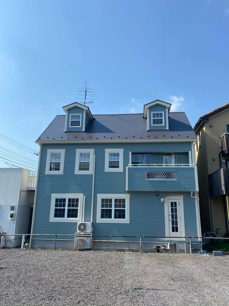 川口市で外壁塗装・塗り替えなら山際建設へ。ピンク色の外壁を爽やかな水色に。 塗装をする前に、大工による事前点検・補修で長持ち&安心の施工をさせていただきました。